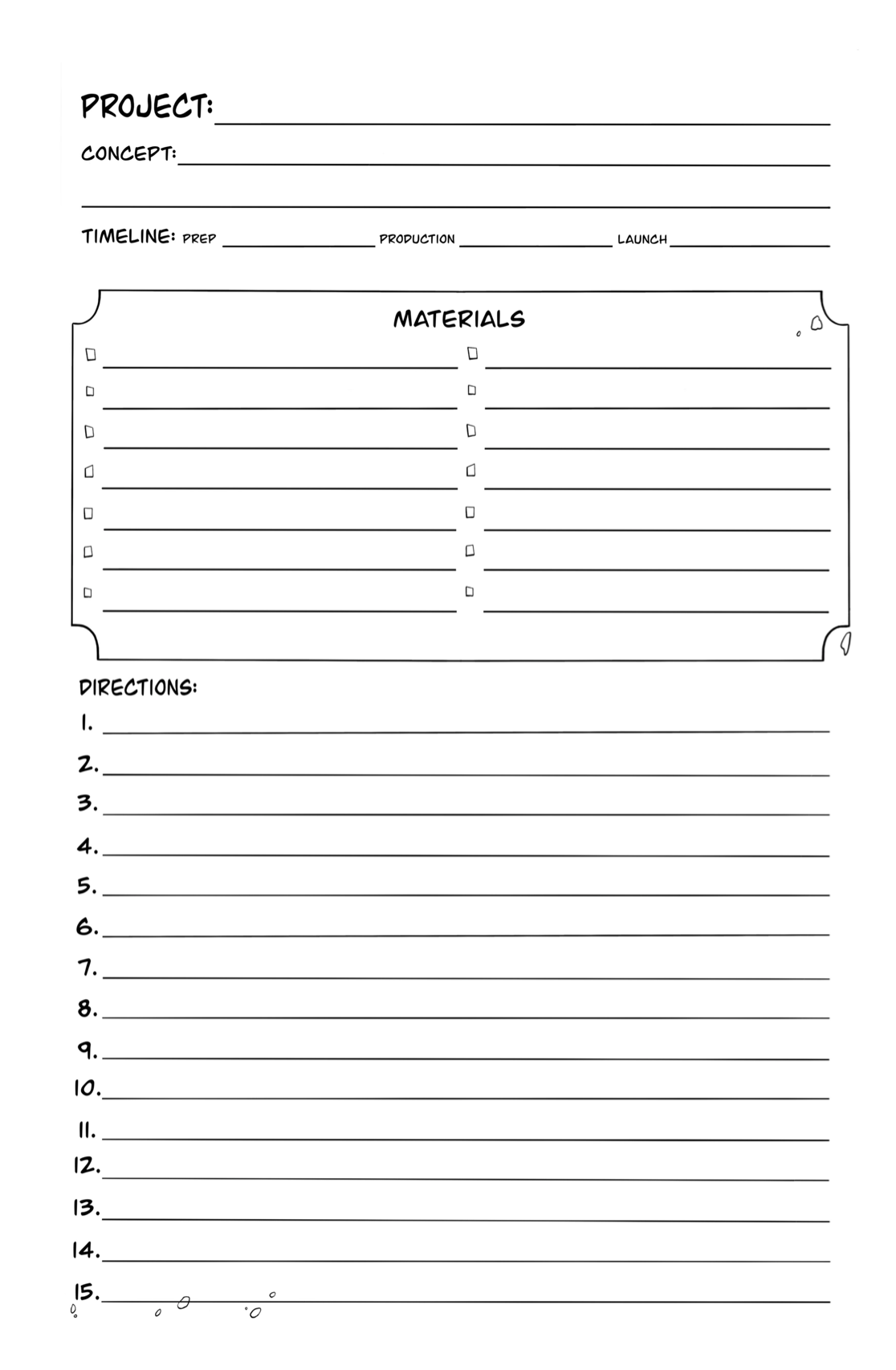 How it works: The Project Recipe Book has 50 project recipe pages and 50 clipboard brainstorm pages. On each recipe page, you log ideas away for future you by giving the project a name. You write a brief concept overview and take a guess at what time the project will take from prep to launch. List a few materials needed; this'll look different from medium to medium. Finally, give yourself a set of solid steps to help you see the way forward.