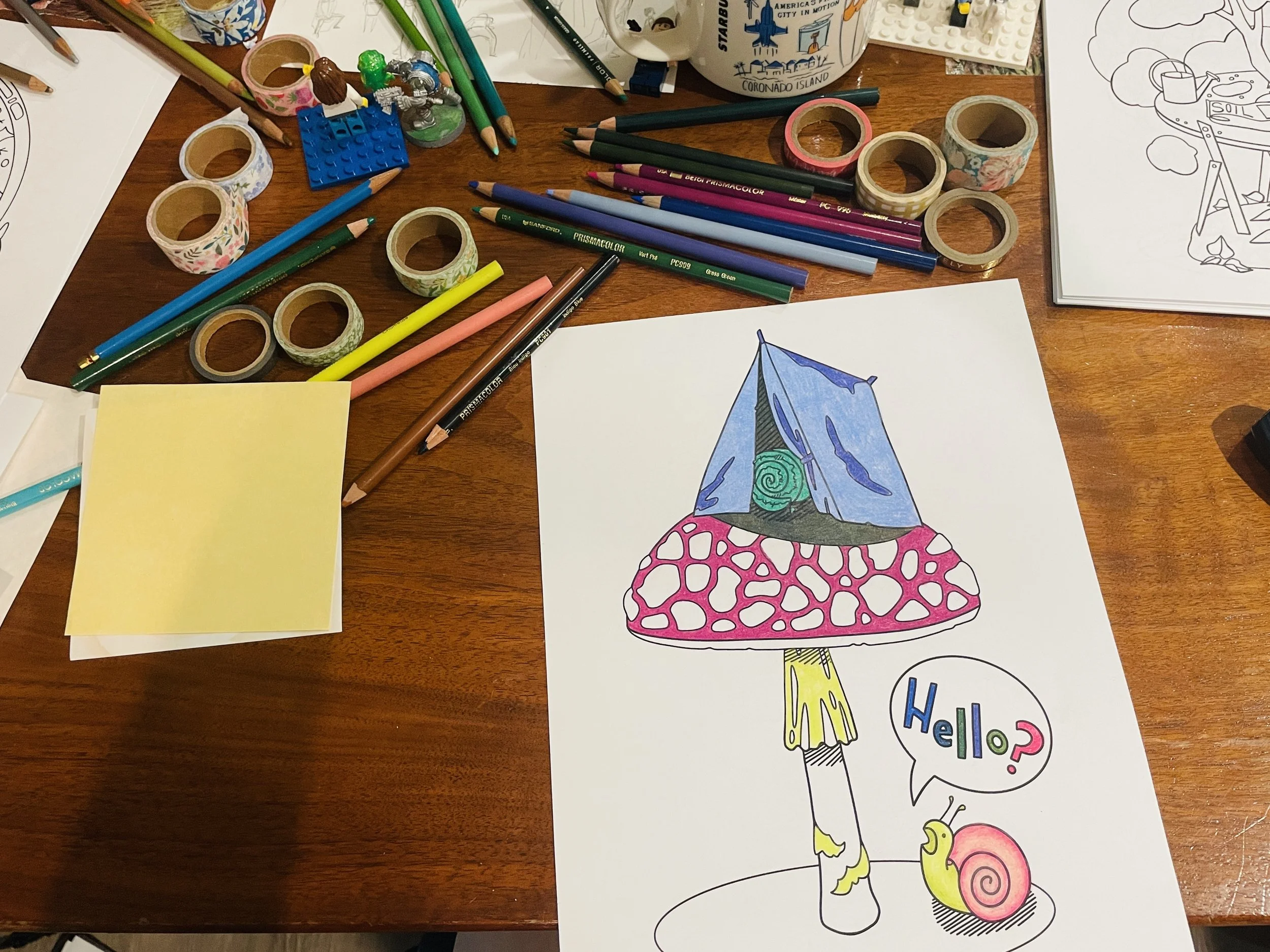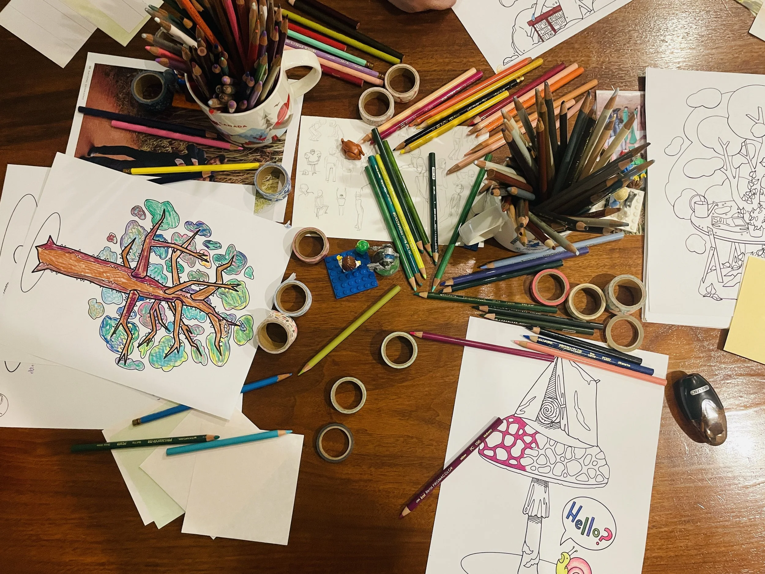We talked a lot about self care and we enjoyed pointing out differences in how we’d drawn our little people. Eventually people ran out of drawing ideas. Hands stilled, but the conversation still had a lovely flow. I pulled out coloring pages from my most recent book, Creative Escapes: Treehouse Coloring, and we kept going. I love chatting while coloring. It’s such a restful way to spent time with people.