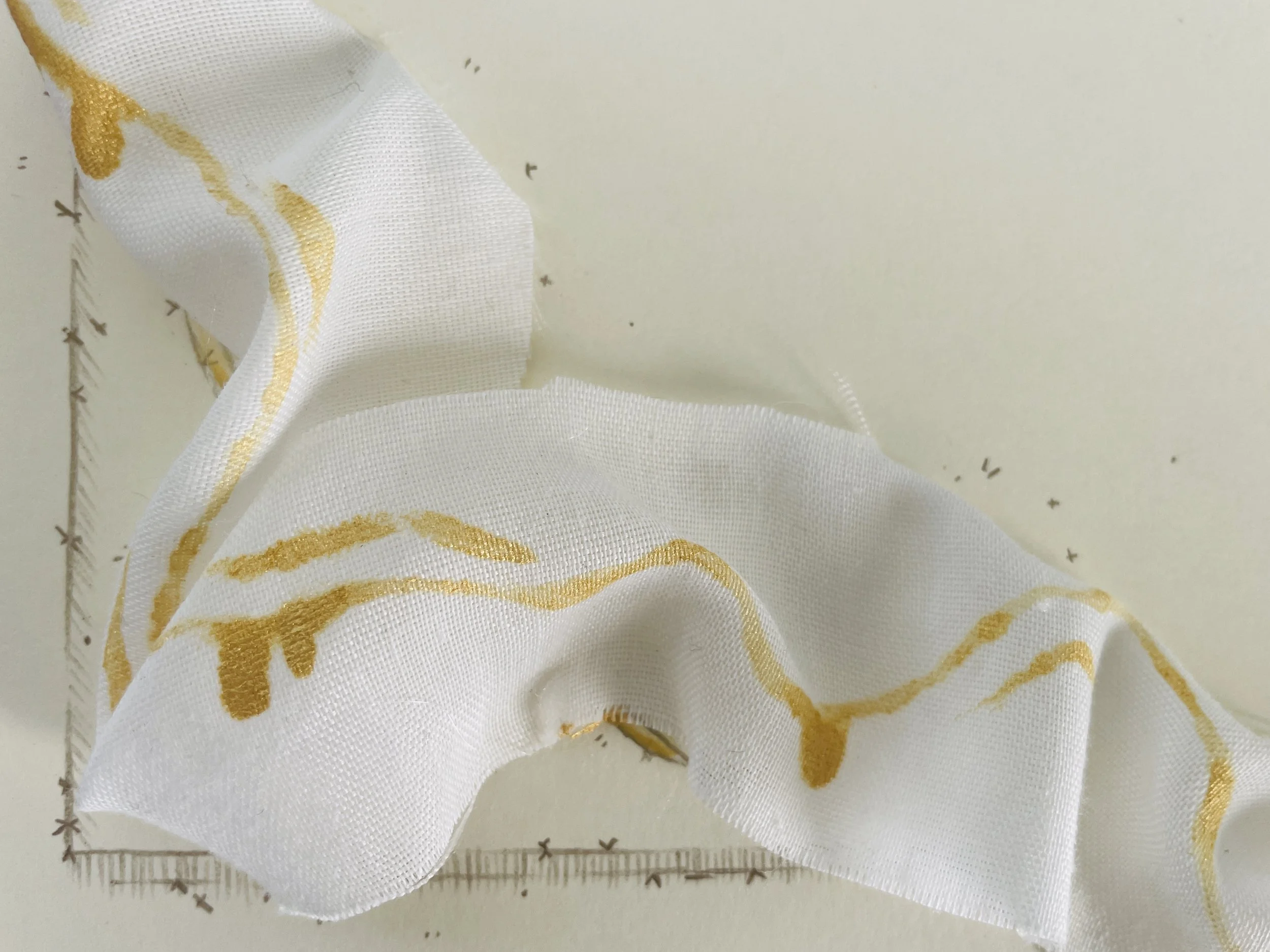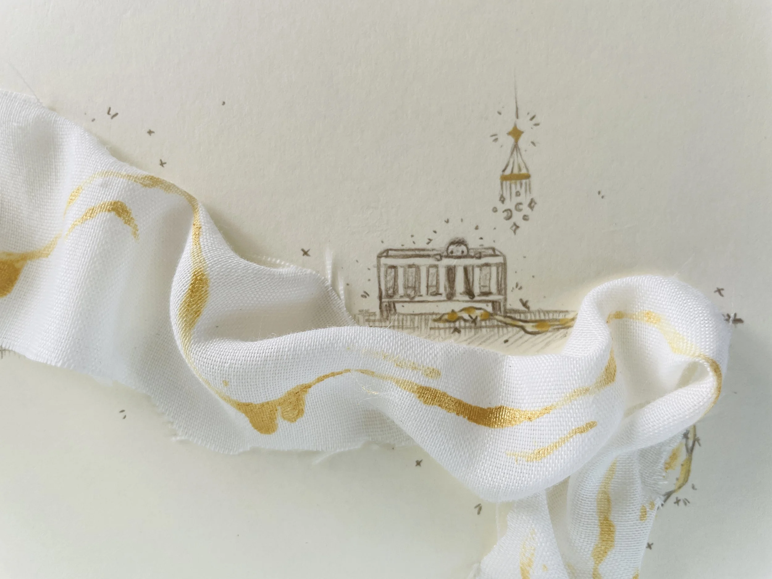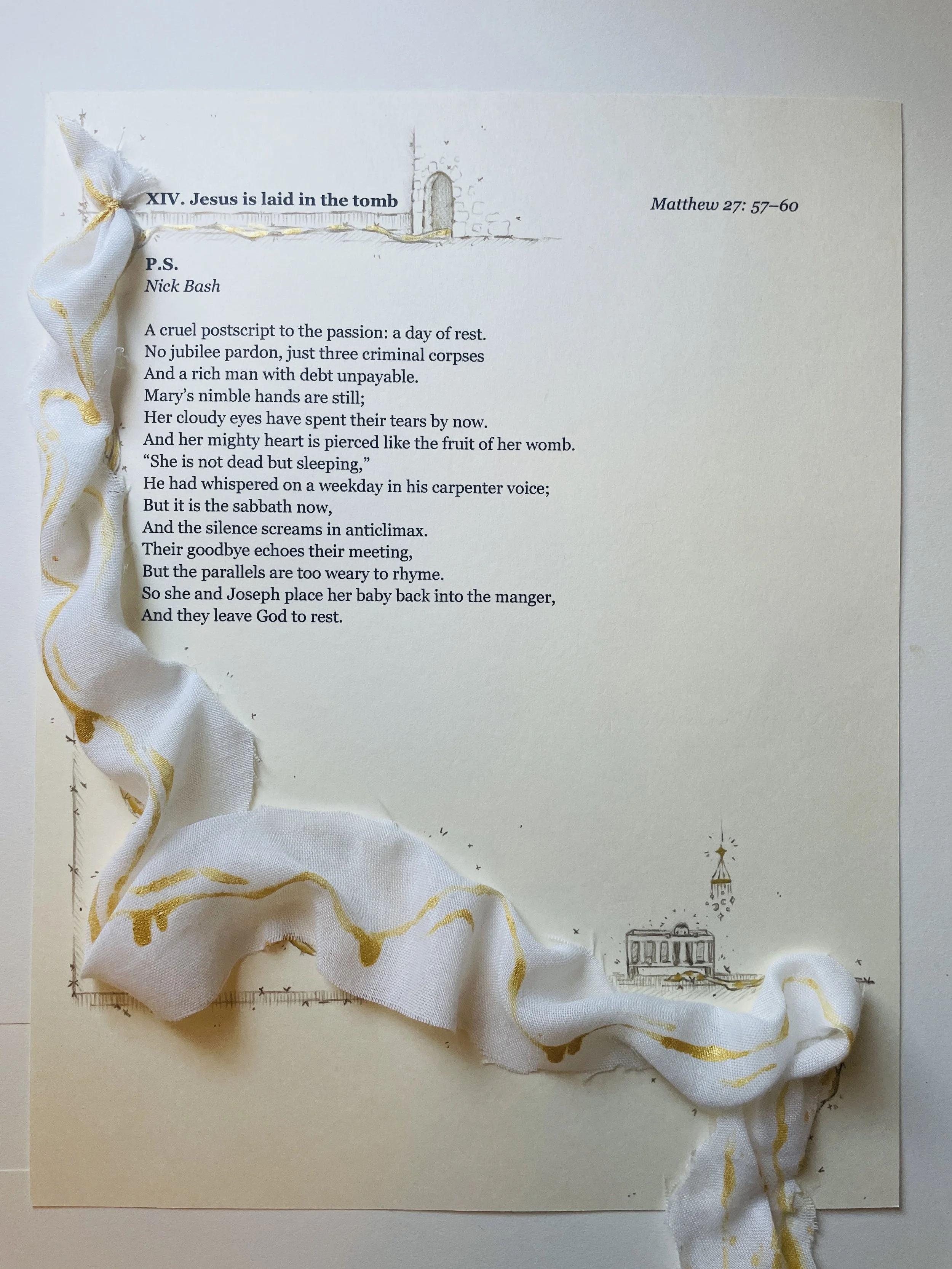 Starting with a strip of fabric, I let light layers guide the illumination process. A bit of hot glue allowed me to drape a winding sheet down from the title of the poem down to an imaginary horizon line, and across to where I imagined I’d draw a manger. I added a few lines in gold colored pencil to give a bit of structure, and then let the poem sit on my desk again.