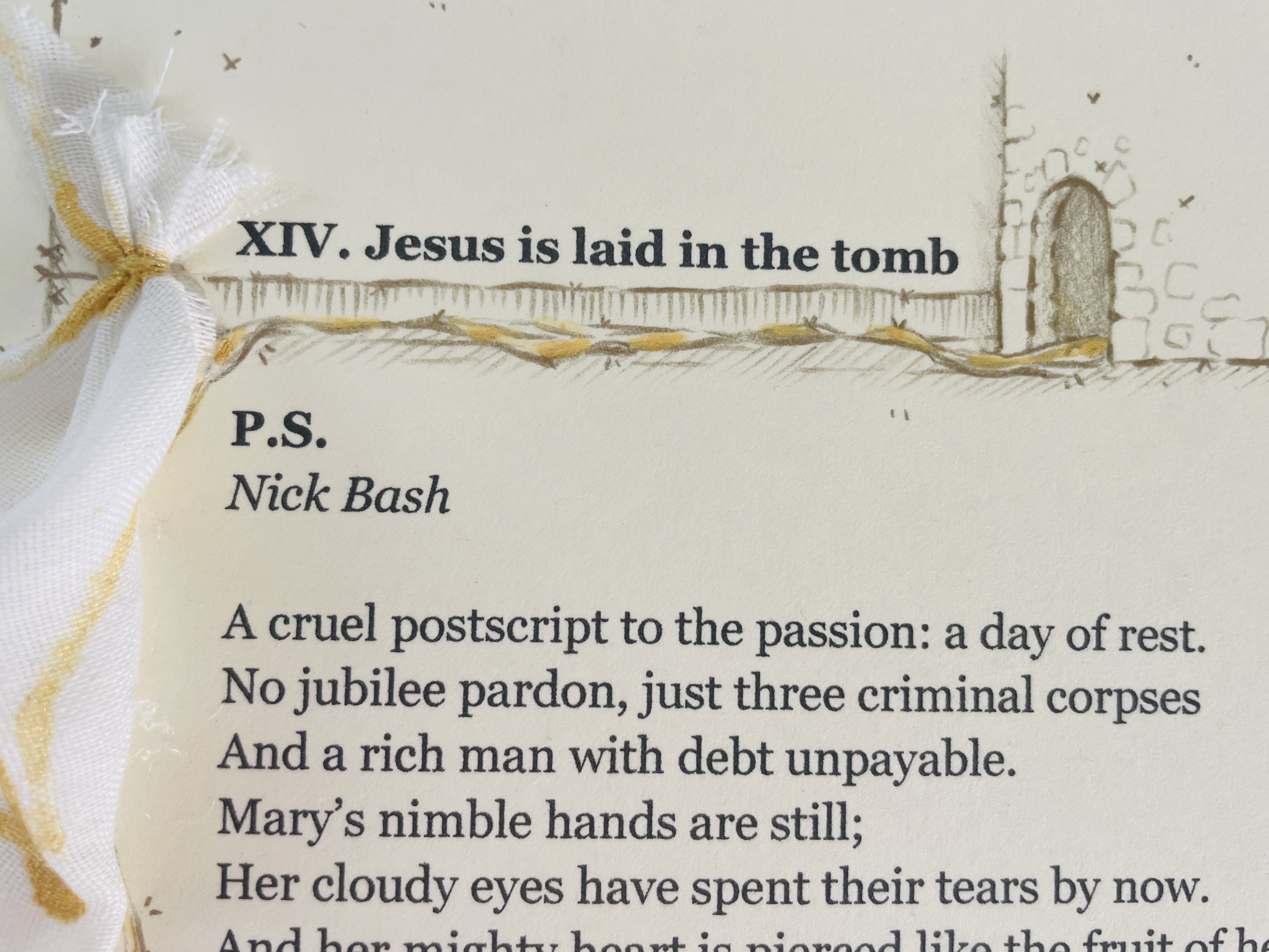 My church does a Stations of the Cross art project for the season of Lent, and each year it reminds me how incredibly nice it is to be in a community that values creativity, imagination, and artistry. This year, the project involved pairing poets with artists, so I said yes to illuminating a poem written by Nick Bash. The arts council handed me a cardstock printout which I left on my desk, unsure what I wanted to do.