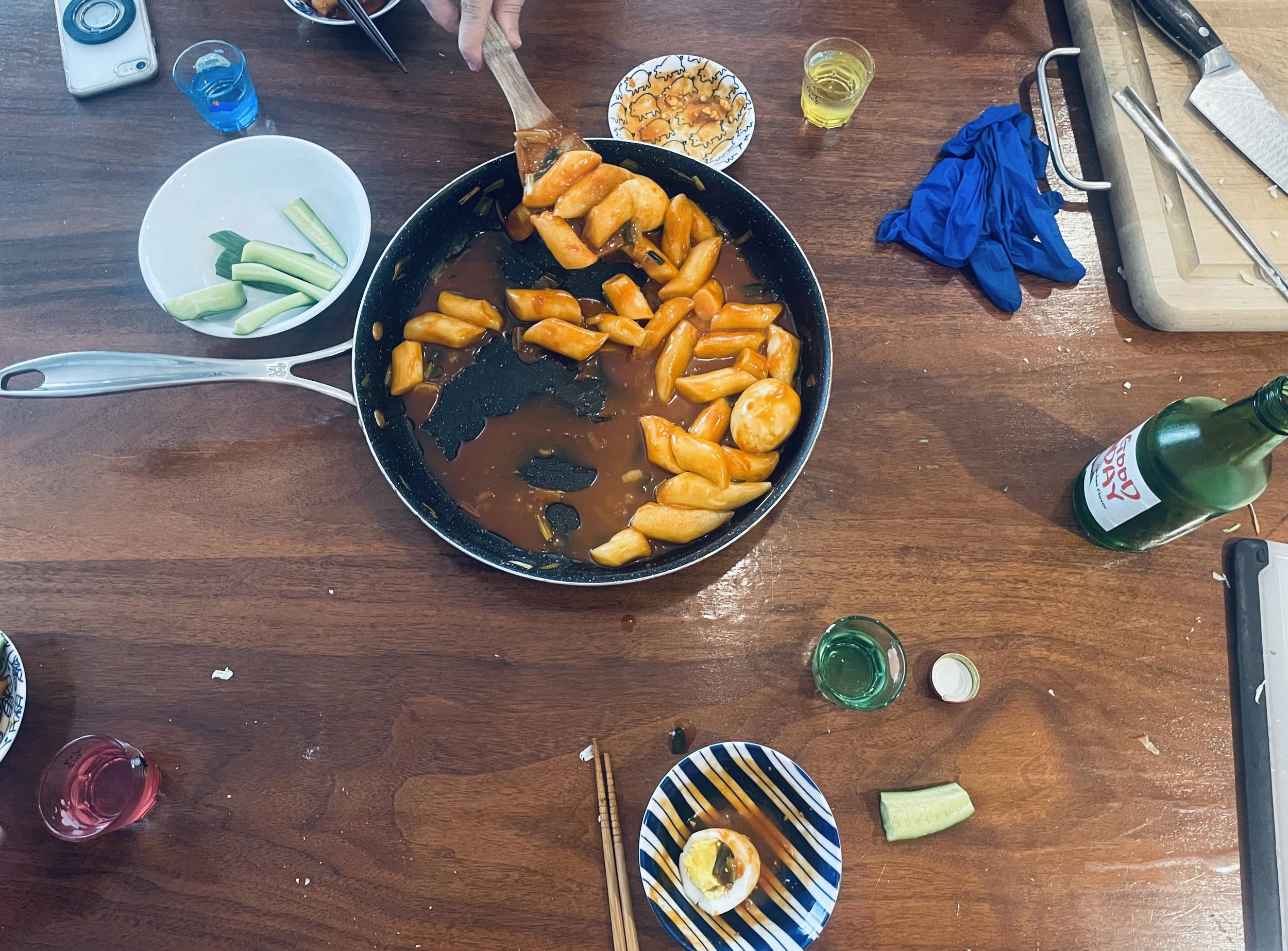 And so begins three hours of labor. We work side by side, having an old fashioned gossip. In my experience the word gossip is loaded, but the word chat doesn’t quite cover it. You get what I mean. We finish chopping everything for the filling, but the cabbage hasn’t finished brining. So I make spicy tteokbokki and cut refreshing cucumber.